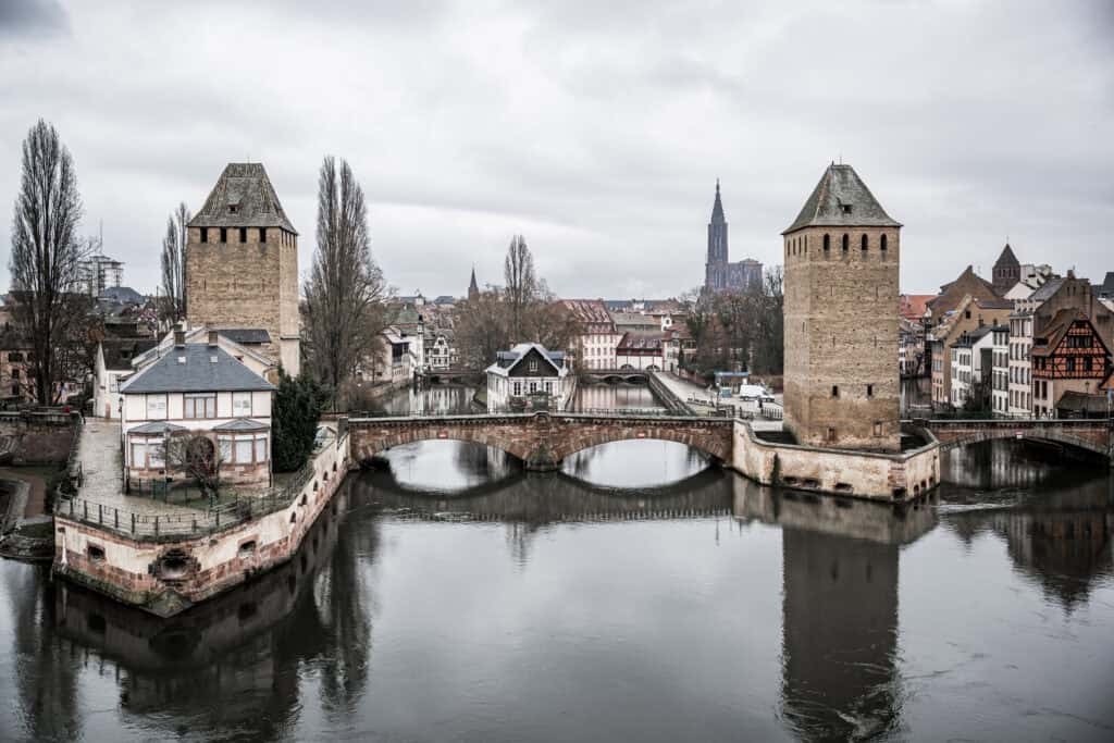 Der Name „Ponts Couverts“ (gedeckte Brücken) ist ein Relikt aus dem Mittelalter. Damals waren die Brücken tatsächlich mit Holzüberdachungen versehen, um die Wachen vor Regen zu schützen. Diese Überdachungen gibt es heute nicht mehr, aber der Name blieb erhalten. Ein kurioser Funfact: Die vier Wehrtürme dienten im 18. Jahrhundert zeitweise als Gefängnisse für Deserteure und Verbrecher. Heute sind sie eines der beliebtesten Fotomotive in Straßburg – vor allem in der blauen Stunde spiegeln sich Türme und Brücken spektakulär im Wasser.